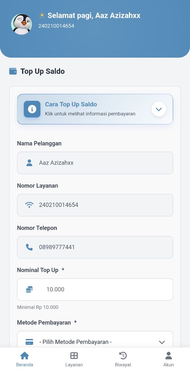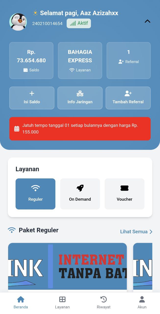 PerbesarAplikasi Android khusus pelanggan untuk mengecek tagihan, status koneksi, riwayat pembayaran, tiket bantuan, dan notifikasi real-time langsung dari smartphone.